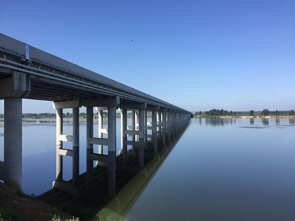 濰河特大橋?yàn)镚309榮蘭線石埠至濰坊段改建工程新建橋梁,中心樁號(hào)K302+737.5。該橋平面位置位于直線段上,跨徑組合52-30m,上部結(jié)構(gòu)采用30米預(yù)應(yīng)力砼小箱梁(先簡(jiǎn)支后連續(xù)),下部結(jié)構(gòu)采用肋板臺(tái)、柱式墩、鉆孔灌注樁基礎(chǔ)。橋全長(zhǎng)1567米,橋?qū)?.5米防撞墻+11.207米行車道+0.586米新澤西護(hù)欄+11.207米行車道+0.5米防撞墻,全寬24米。鋪裝層采用10cm瀝青砼+SBS防水層+15cmC50防水砼。橋面鋪裝采用4孔一聯(lián),全橋共13聯(lián),橋臺(tái)采用D80伸縮縫,橋墩伸縮處采用D160伸縮縫。全橋總造價(jià)16528萬(wàn)元,由山東宏昌路橋集團(tuán)有限公司承建。